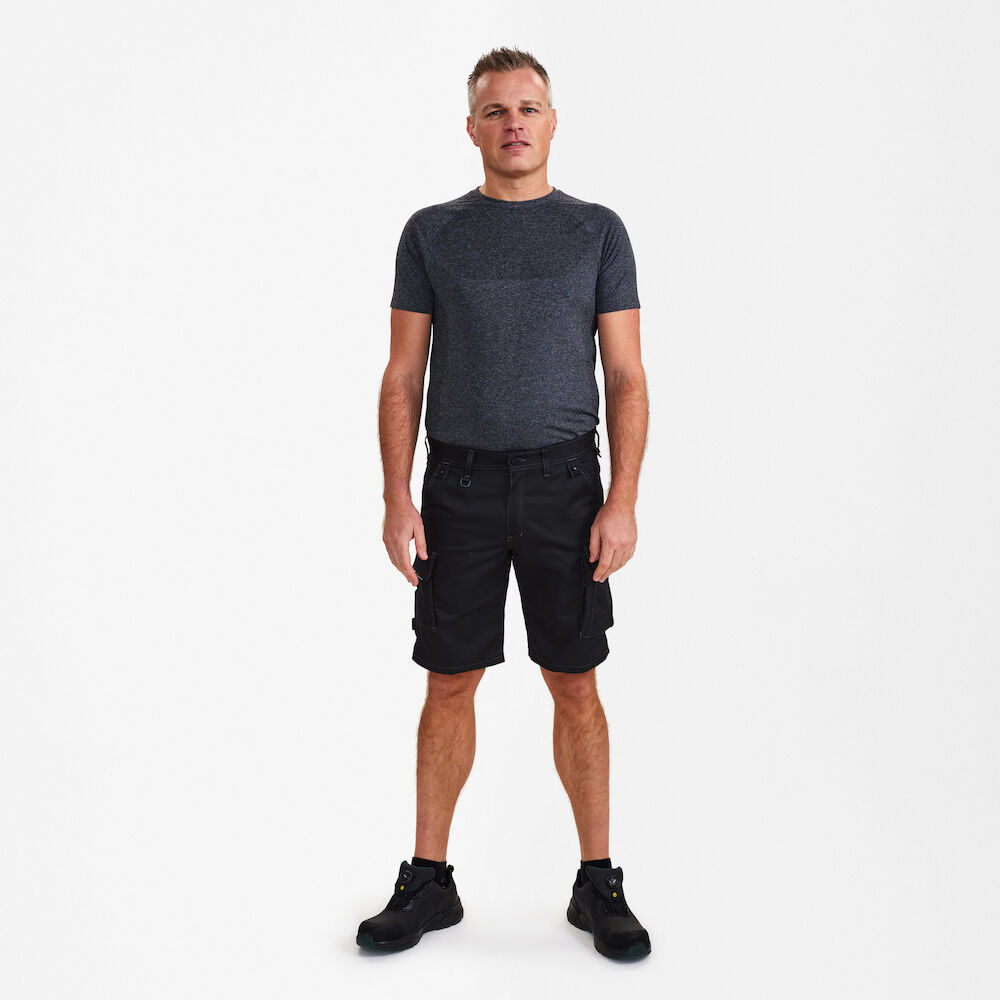 Strækbare, funktionelle håndværkershorts med en smallere pasform og mange praktiske detaljer. Med indsatser af ekstra strækbart og ventilerende materiale i panelet i indersømmen bliver komforten ekstra høj. D-ring foran til påsætning af f.eks. ID-kort. To baglommer. Telefonlomme med klap på højre lår. I venstre side er der en lårlomme med klap. Lårlommen har en ekstra lomme med lynlås. Forstærket tommestoklomme med ekstra inddelinger og værktøjsstropper. Lårlommen og tommestoklommen har begge frithængende bund for optimal bevægelse. Der er mulighed for at montere hængelommer (9360-307).